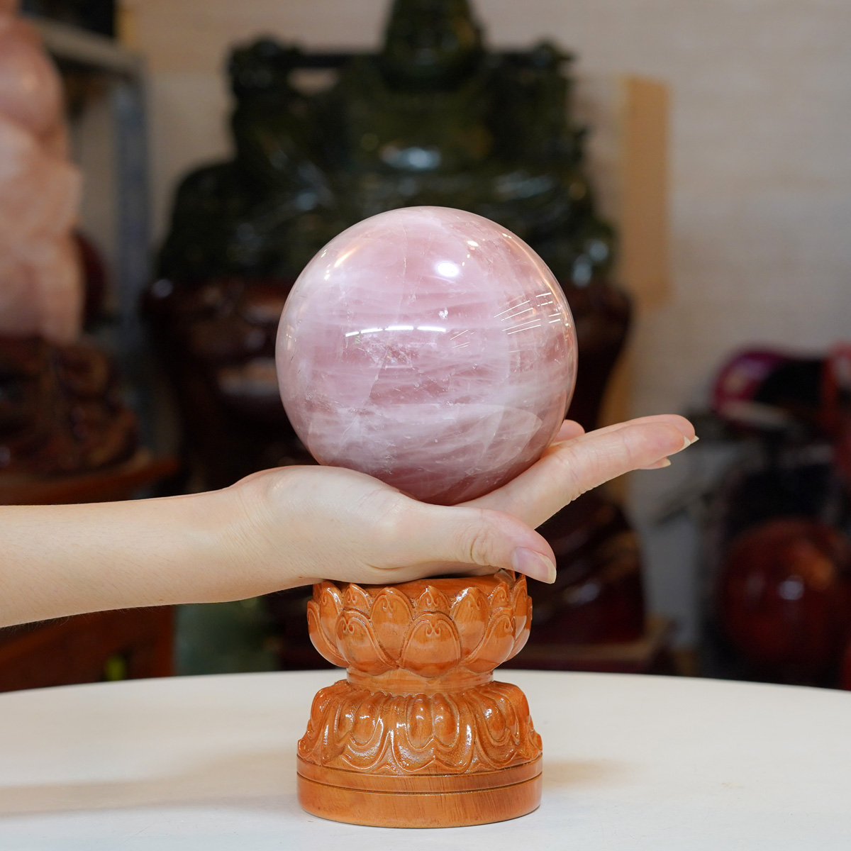 Quả cầu Thạch Anh hồng 1A 1,7kg – 10,8cm + đế gỗ hình sen