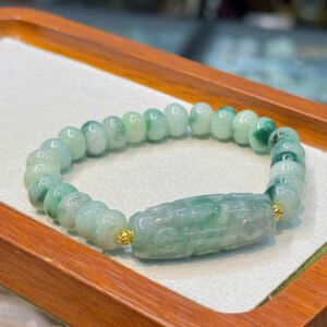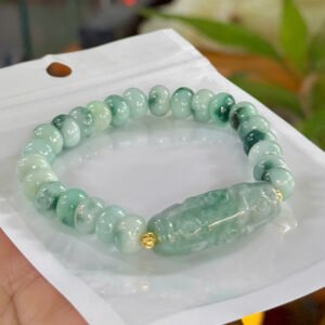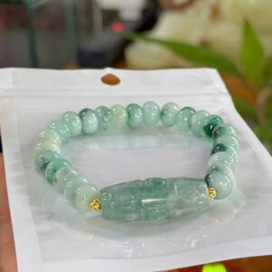 Vòng điếu mập ngọc cẩm thạch A hoa bay xanh 9,5ly mix dzi 9mắt ngọc A hoa bay